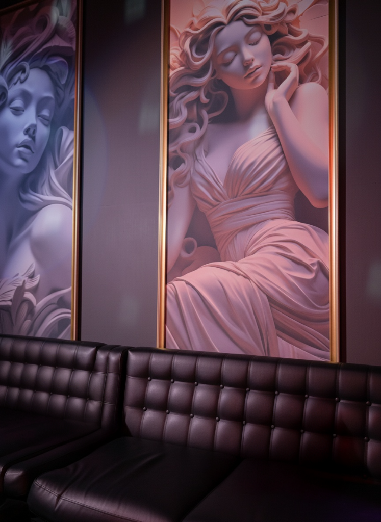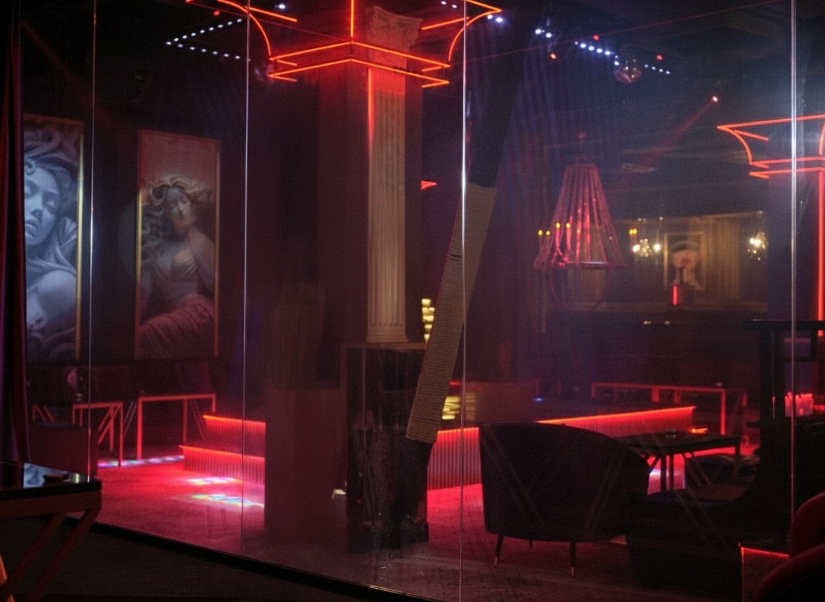 Помещение клуба большое, дизайном занималась какая-то ворона ибо все очень старое и блестящее. Вся эта напускная роскошь для лохов, красные диваны, пыльные шторы, светомузыка, металлические столики и так далее. Антураж сильный. Навеянный кинофильмом Жмурки.